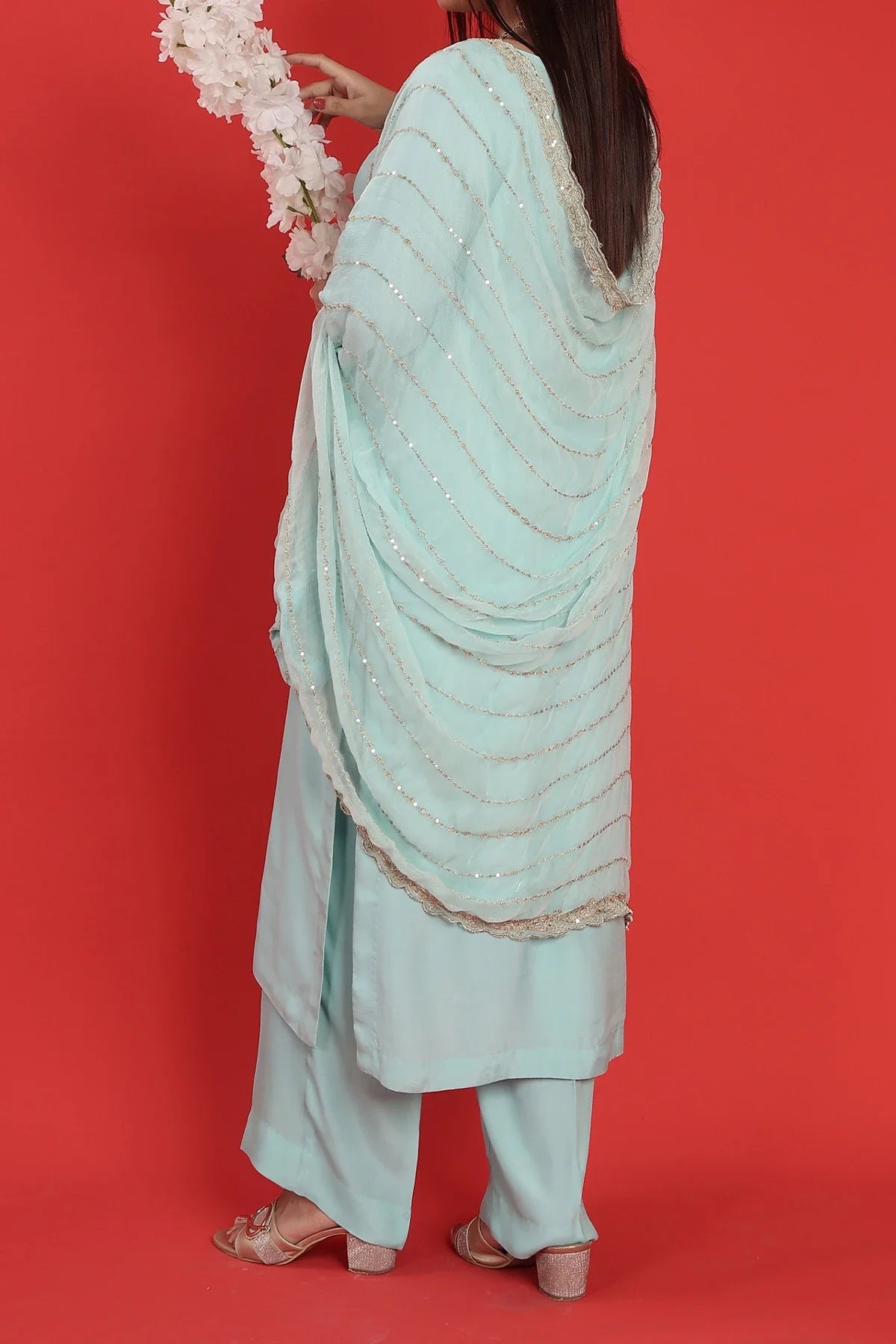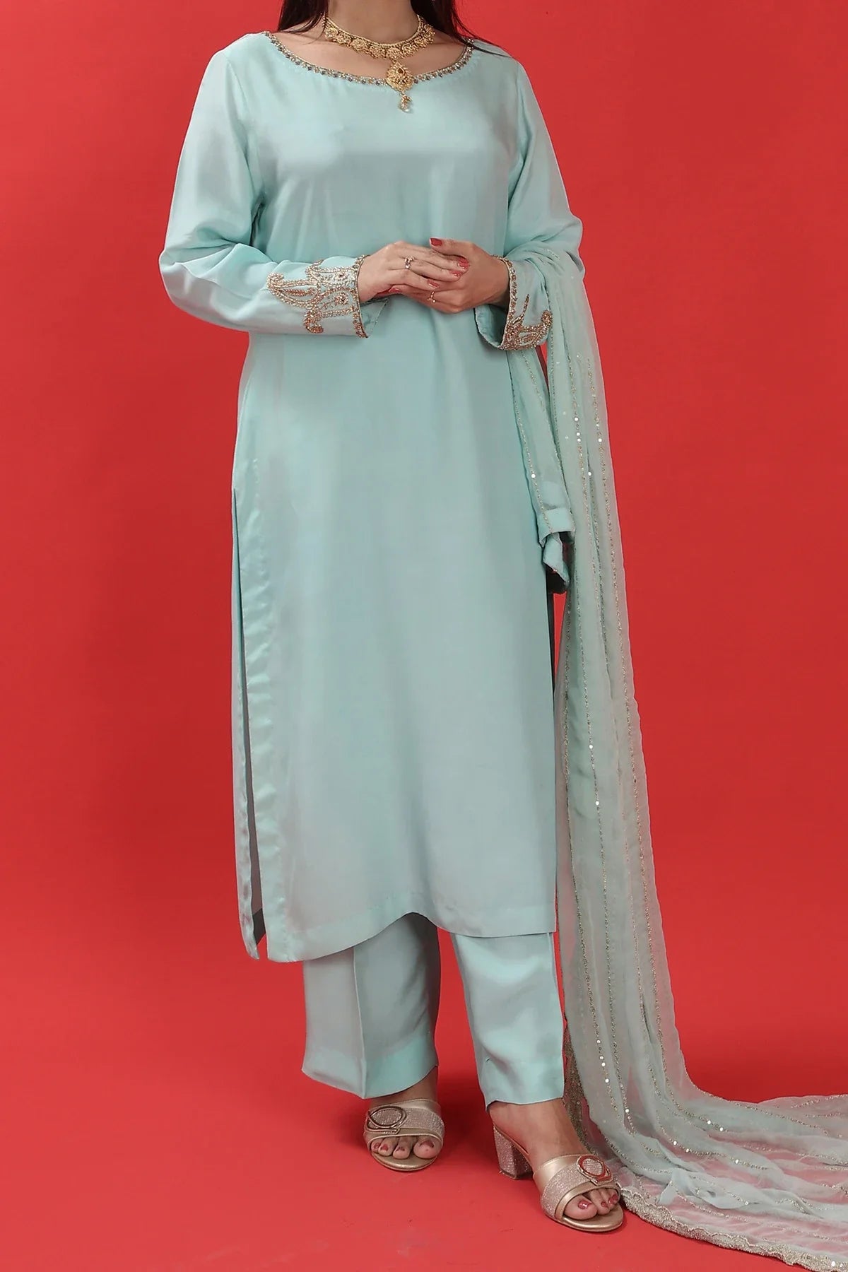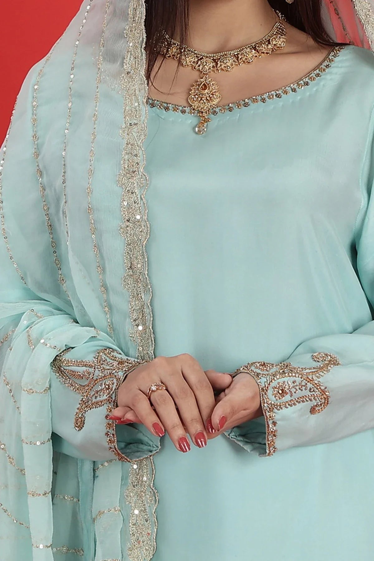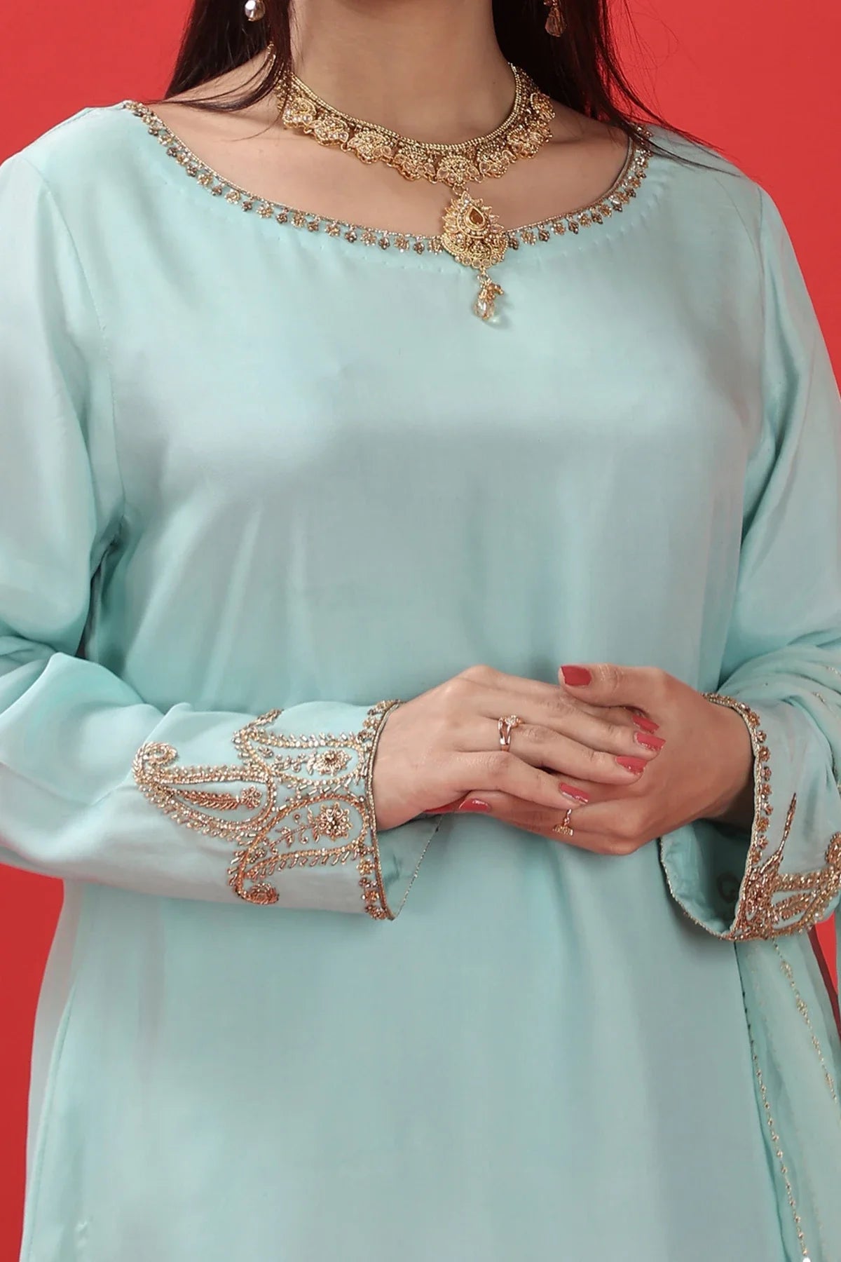 A Beautiful Ferozi three piece is crafted on pure fabric with pasely designing on sleeves, this design is completed with Naqshi, dabka and sequins work done by our expert craftsmen, Paired with chiffon embroidery dupatta and matching trouser. Perfect for those special occasions when you want to make a statement.