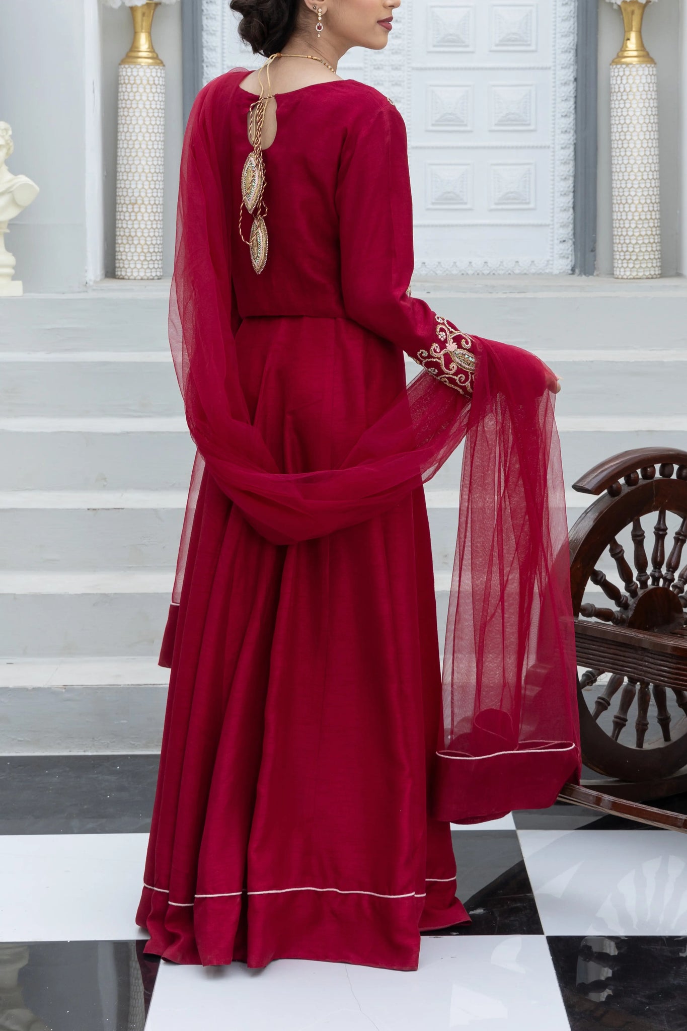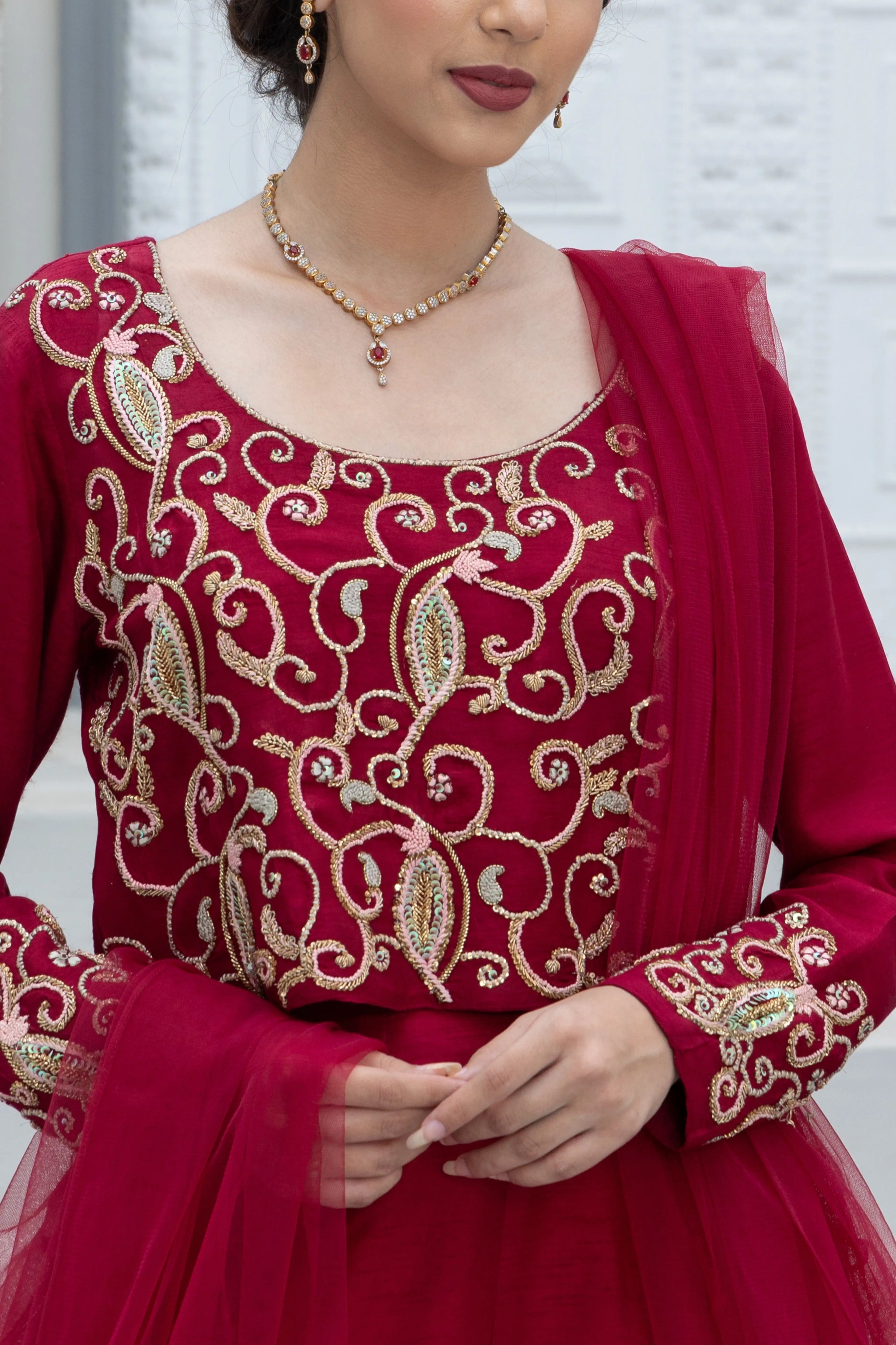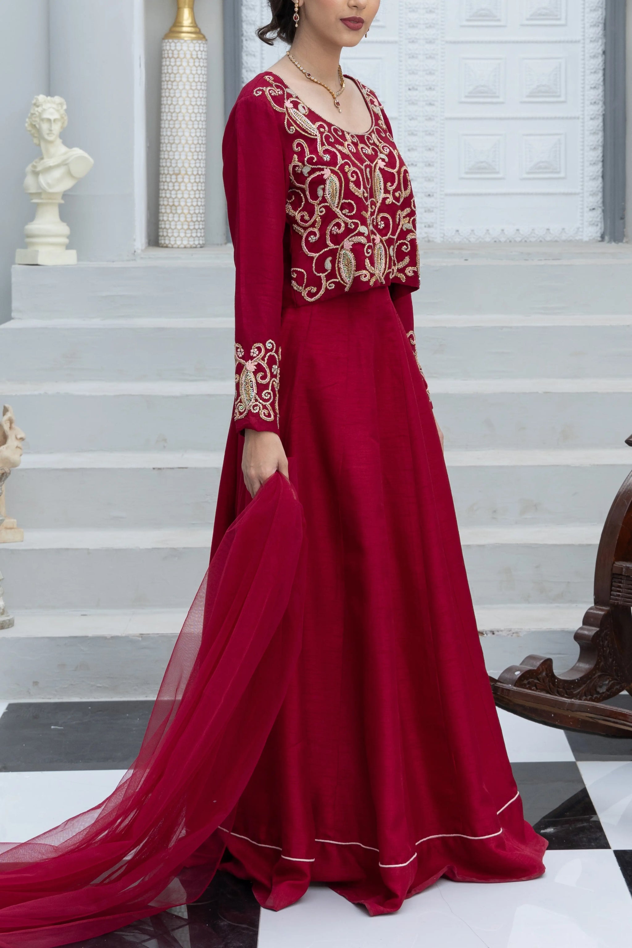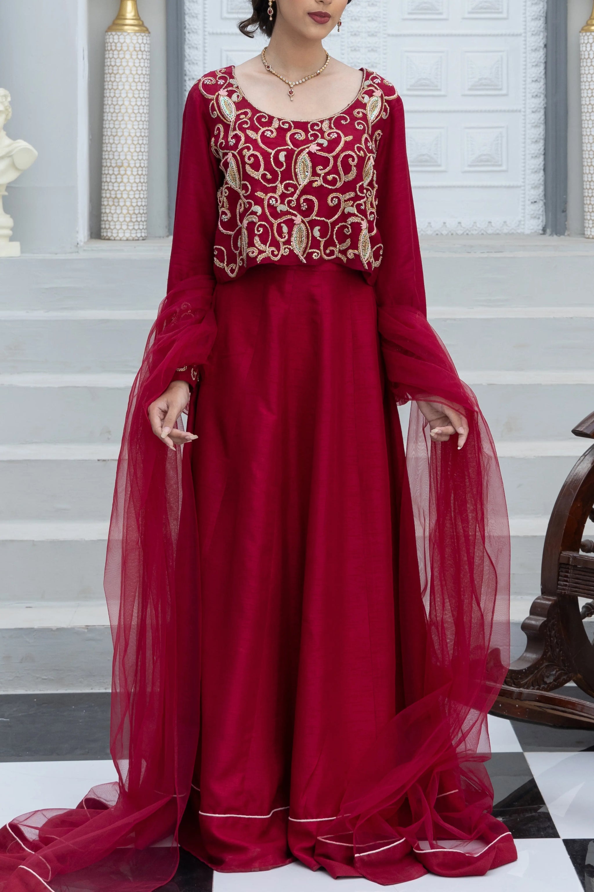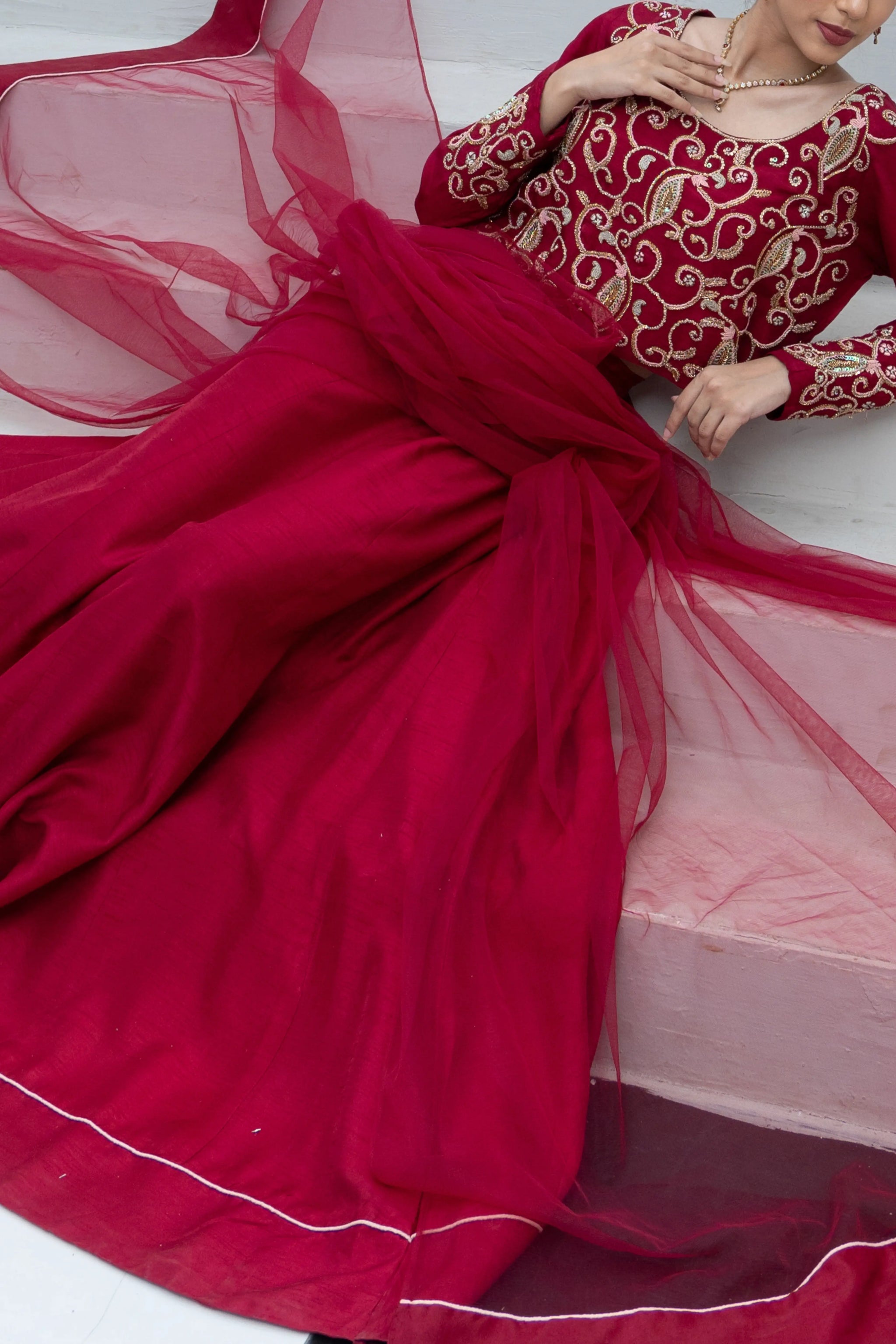 A gorgeous three-piece ensemble crafted in rich maroon raw silk, exquisitely adorned with intricate handwork across the full choli and sleeves. Detailed with traditional naqshi, dabka, sequins, resham, and crystal embellishments, this design radiates festive opulence. The look is completed with a matching net dupatta, delicately finished to enhance its elegance, and a tonal lehenga accented with soft piping along the hemline for a graceful finish. A timeless choice for festive celebrations and special occasions.