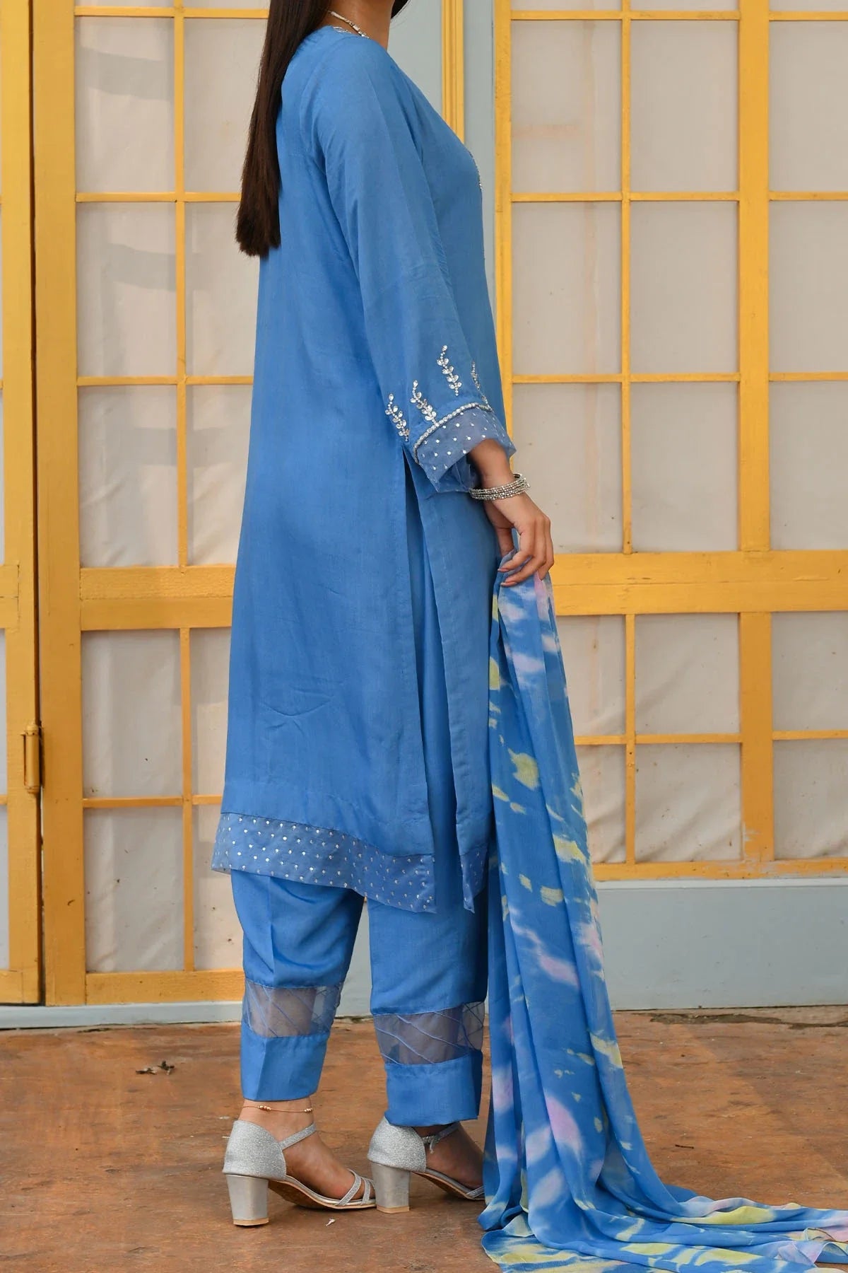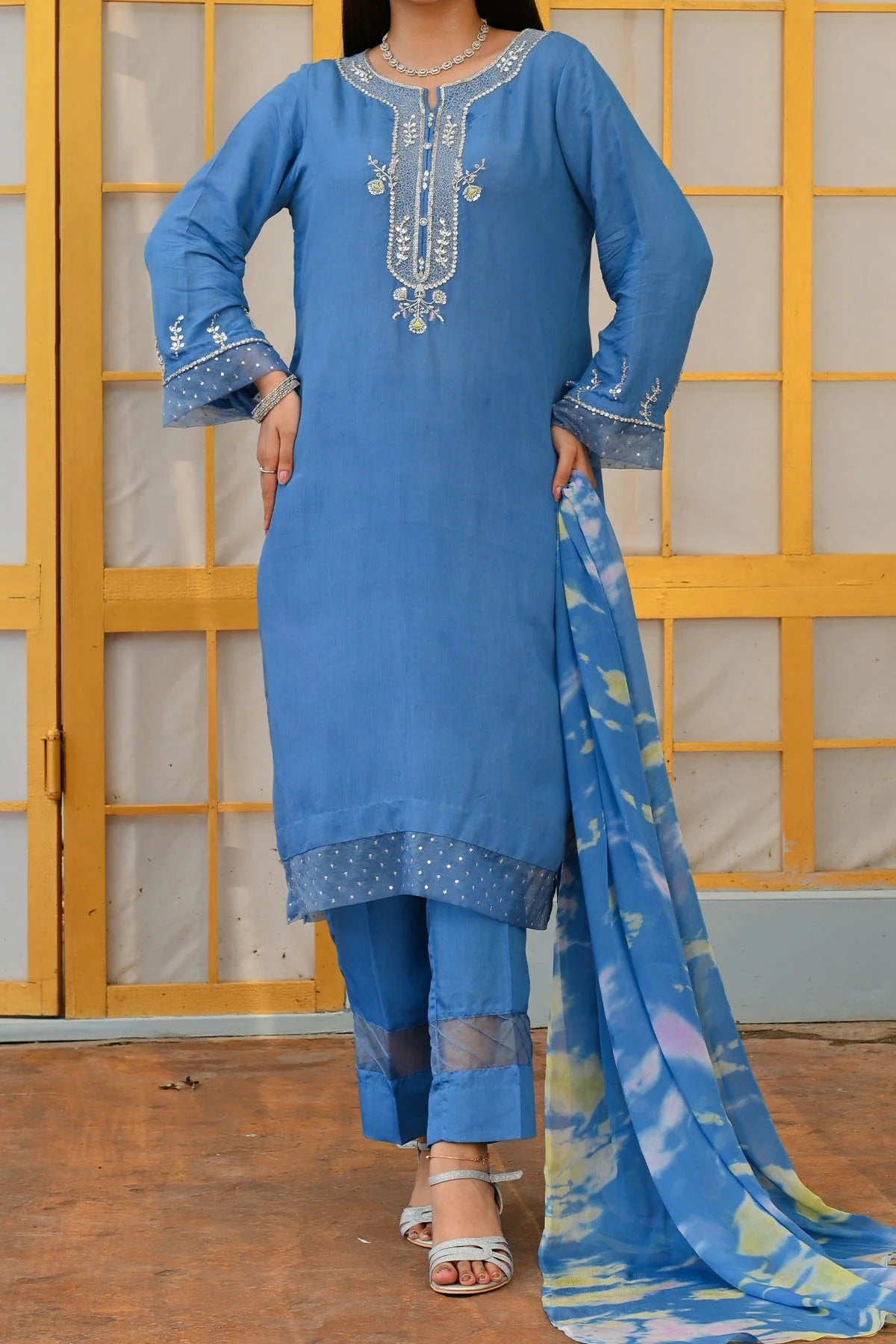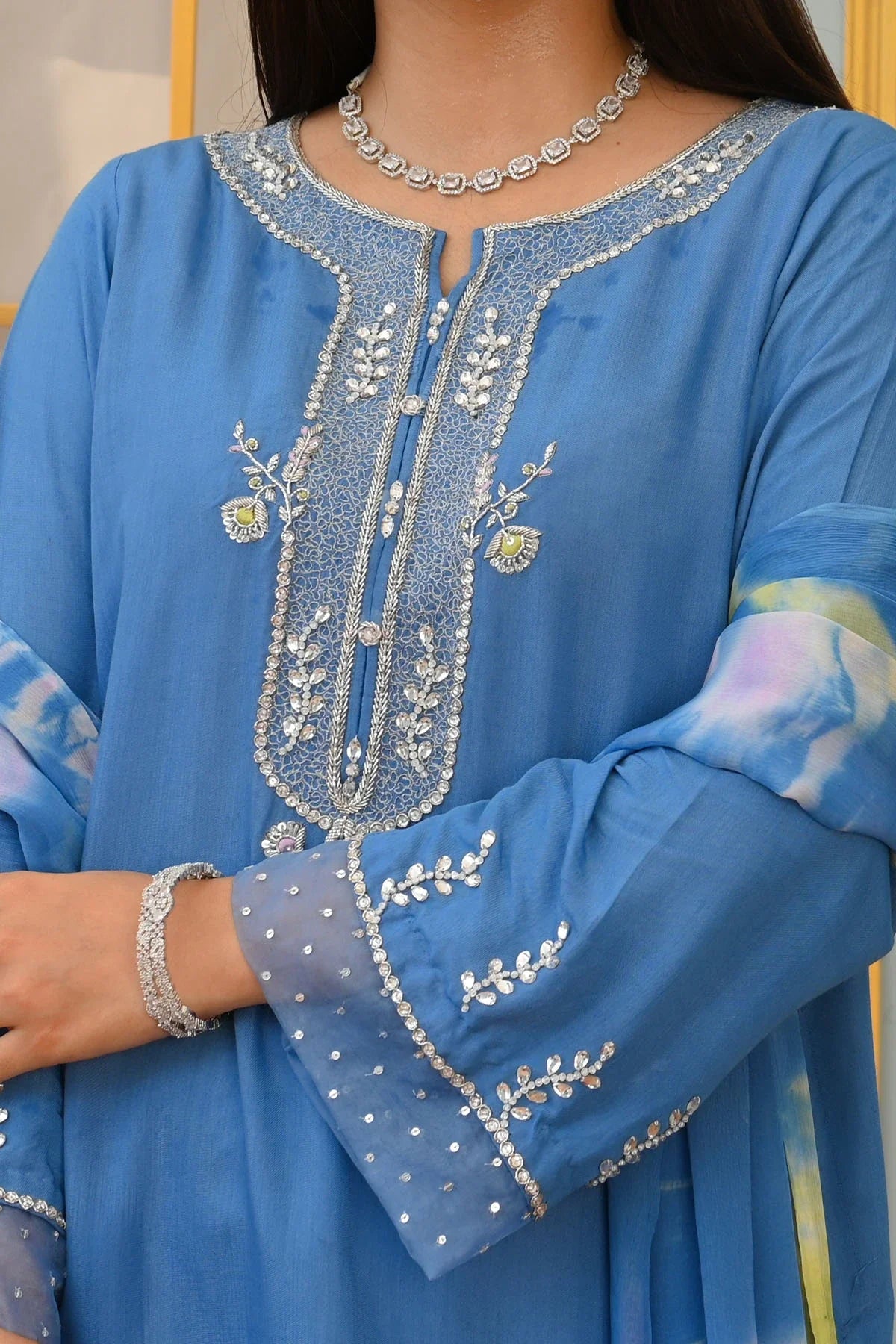 A blue silk shirt adorned with exquisite silver zardozi, Pearls and resham hand work. Same color organza patches on sleeves and bottom of the shirt enhances its beauty. Paired with matching pure silk pants for an elegant look. The ensemble is beautifully complemented by a pure Chiffon tie and die dupatta, Perfect for any special occasion, this outfit combines traditional creativity with contemporary style.