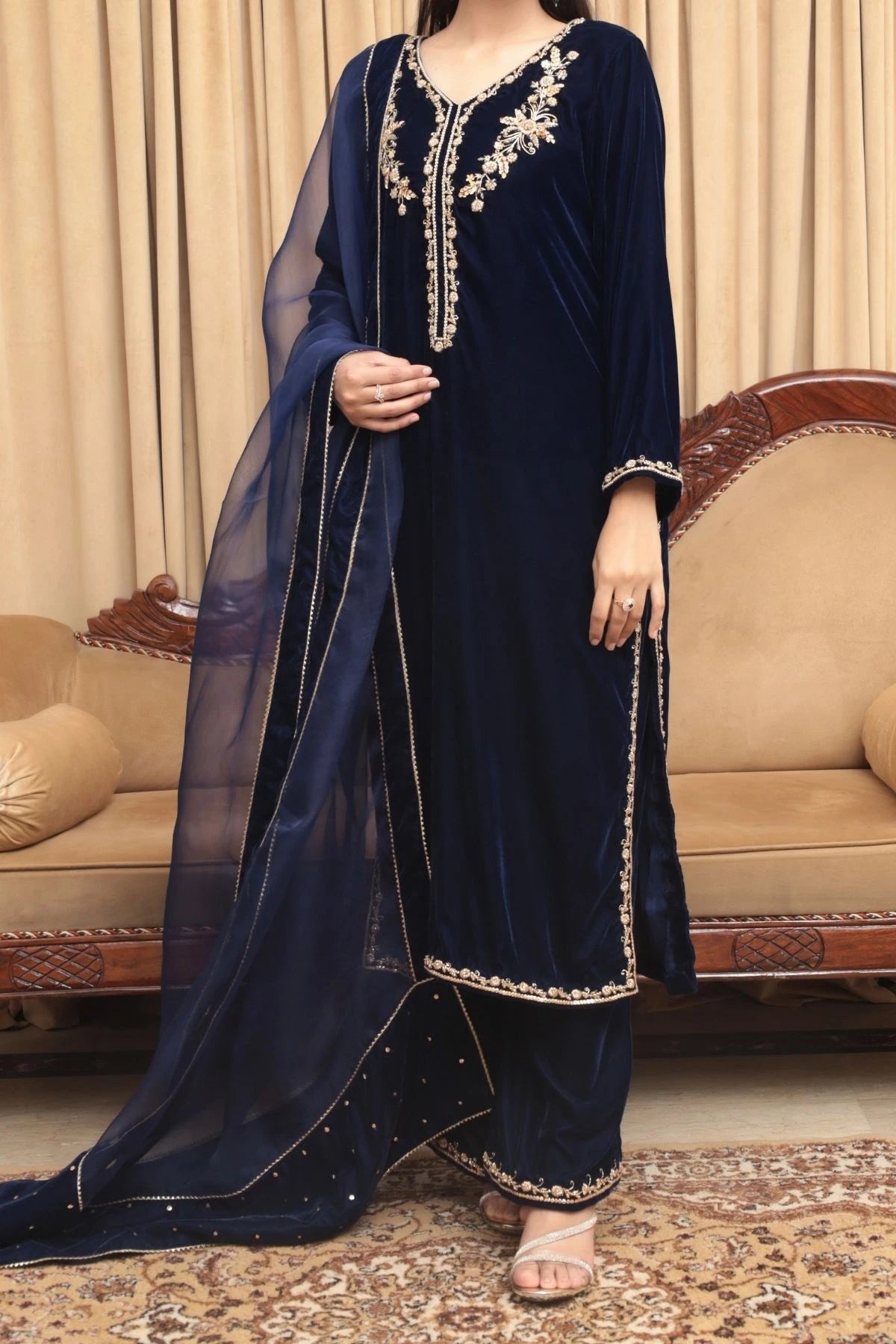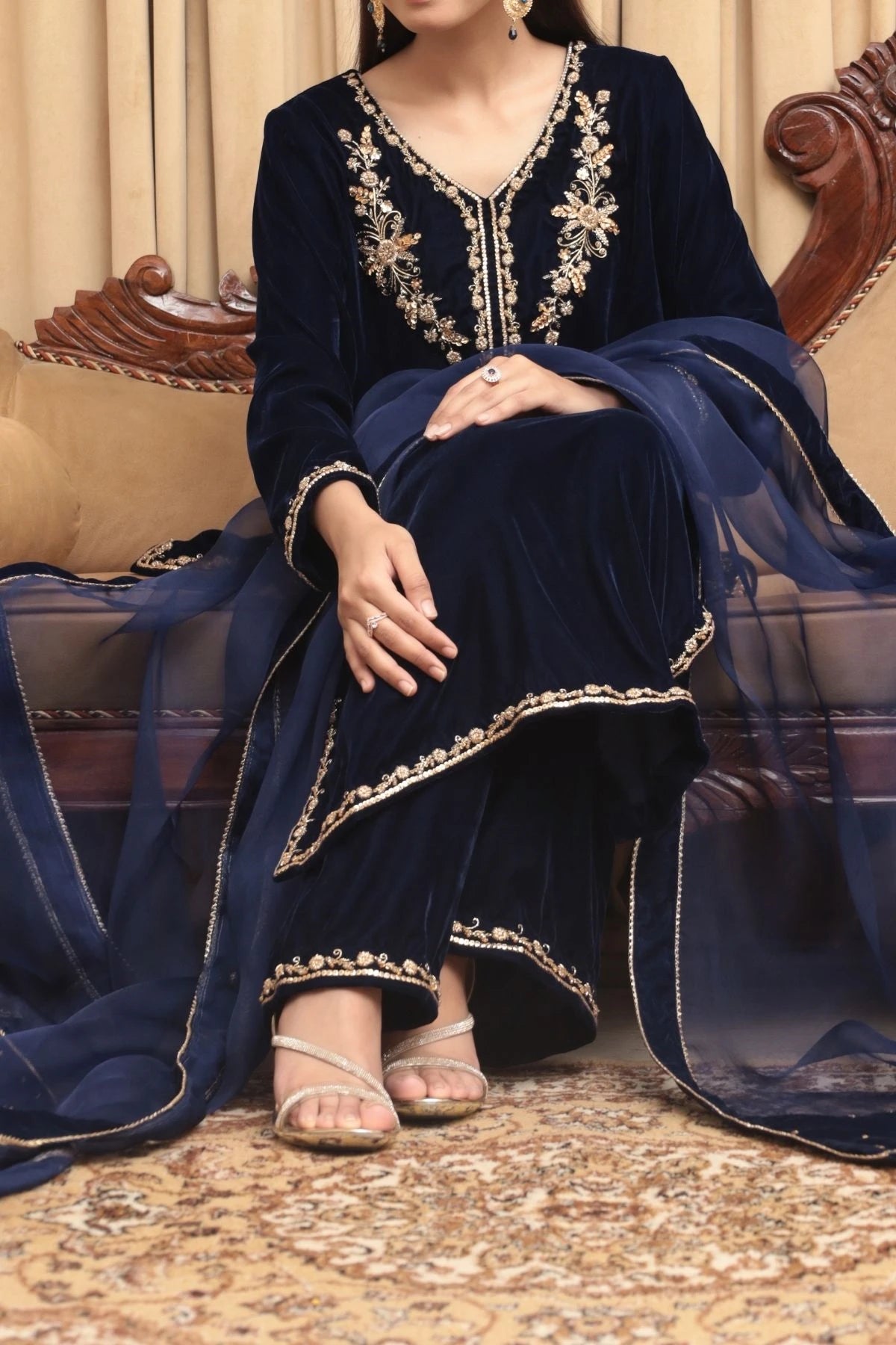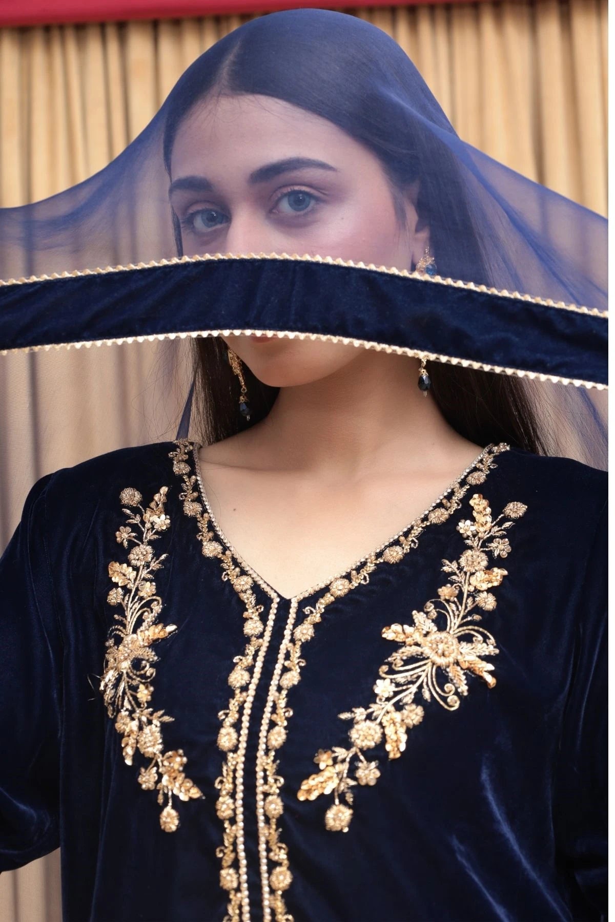 Softly luminous, Ayla is a deep midnight blue velvet ensemble designed for elegant festive evenings. The shirt features delicate hand embellishments along the neckline and sleeve borders, enhanced by a finely detailed chaaks that adds graceful movement to the silhouette. Subtle embellishments along the hem lend a refined finish, while matching velvet straight pants and a pure organza dupatta adorned with fine detailing complete the look. Ayla embodies understated luxury with a serene, moonlit charm.