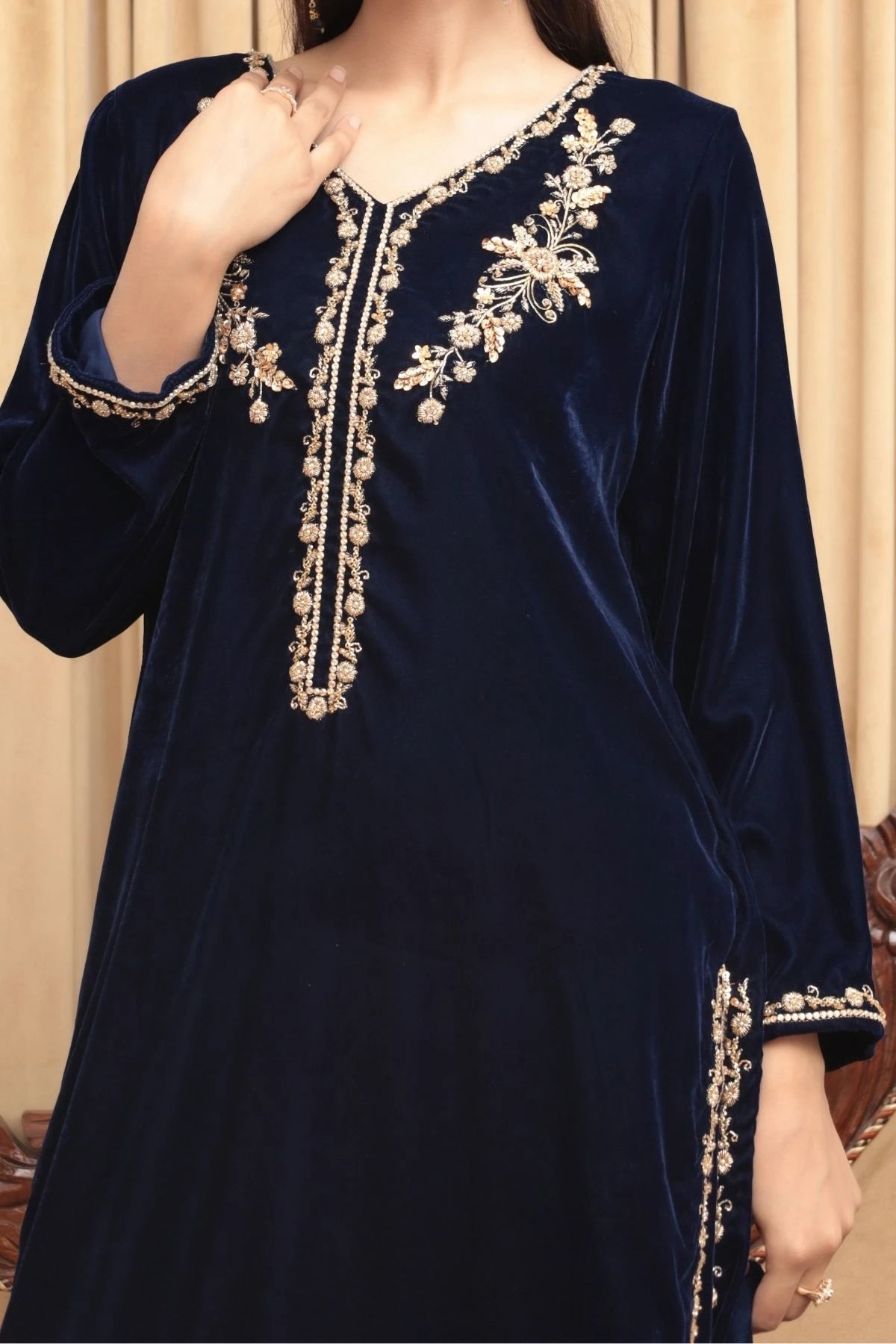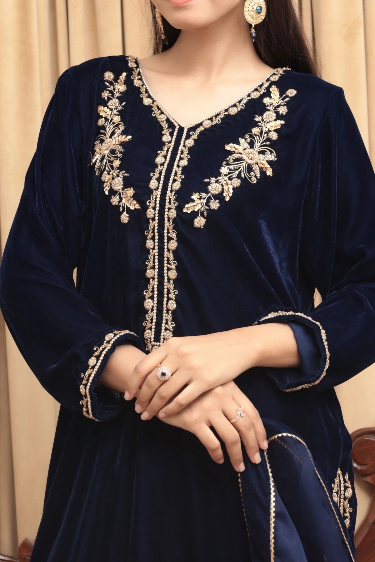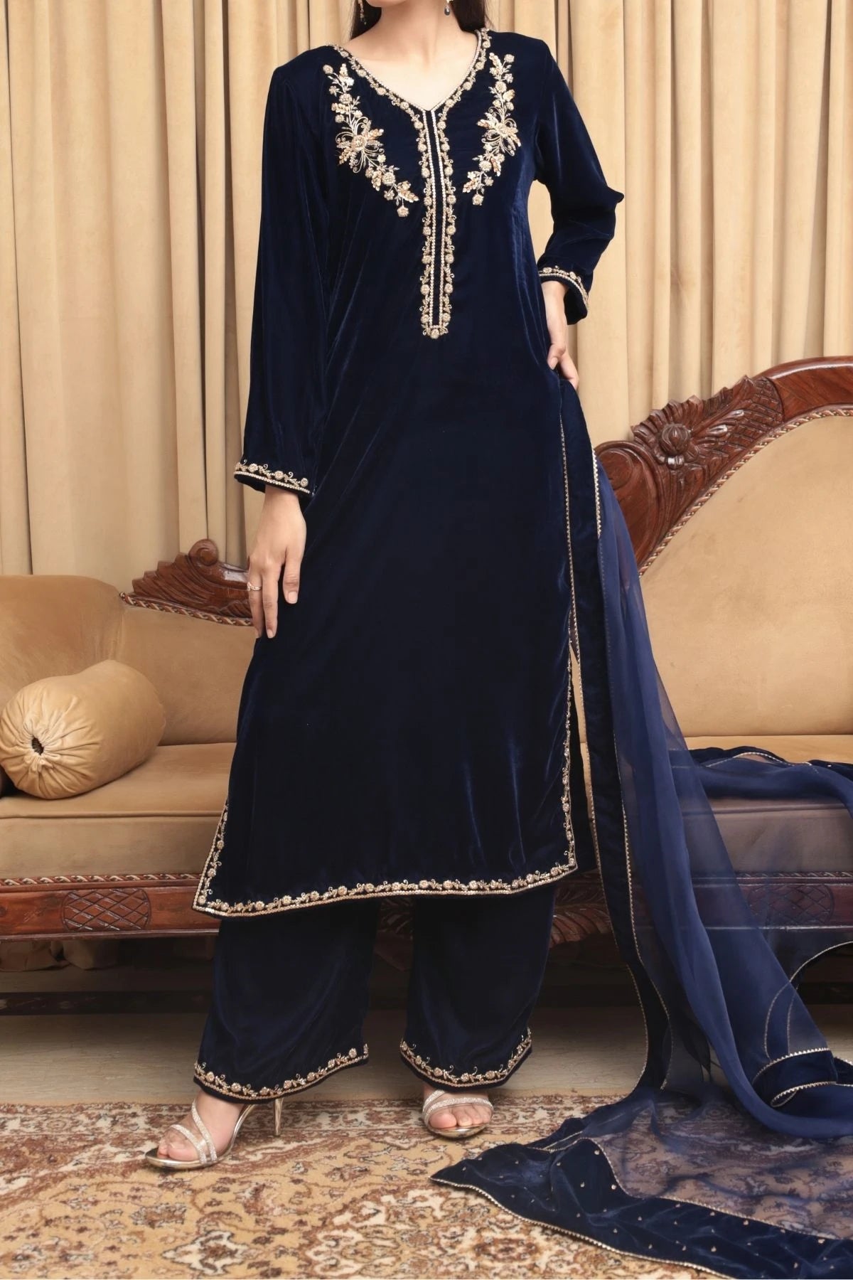 Softly luminous, Ayla is a deep midnight blue velvet ensemble designed for elegant festive evenings. The shirt features delicate hand embellishments along the neckline and sleeve borders, enhanced by a finely detailed chaaks that adds graceful movement to the silhouette. Subtle embellishments along the hem lend a refined finish, while matching velvet straight pants and a pure organza dupatta adorned with fine detailing complete the look. Ayla embodies understated luxury with a serene, moonlit charm.