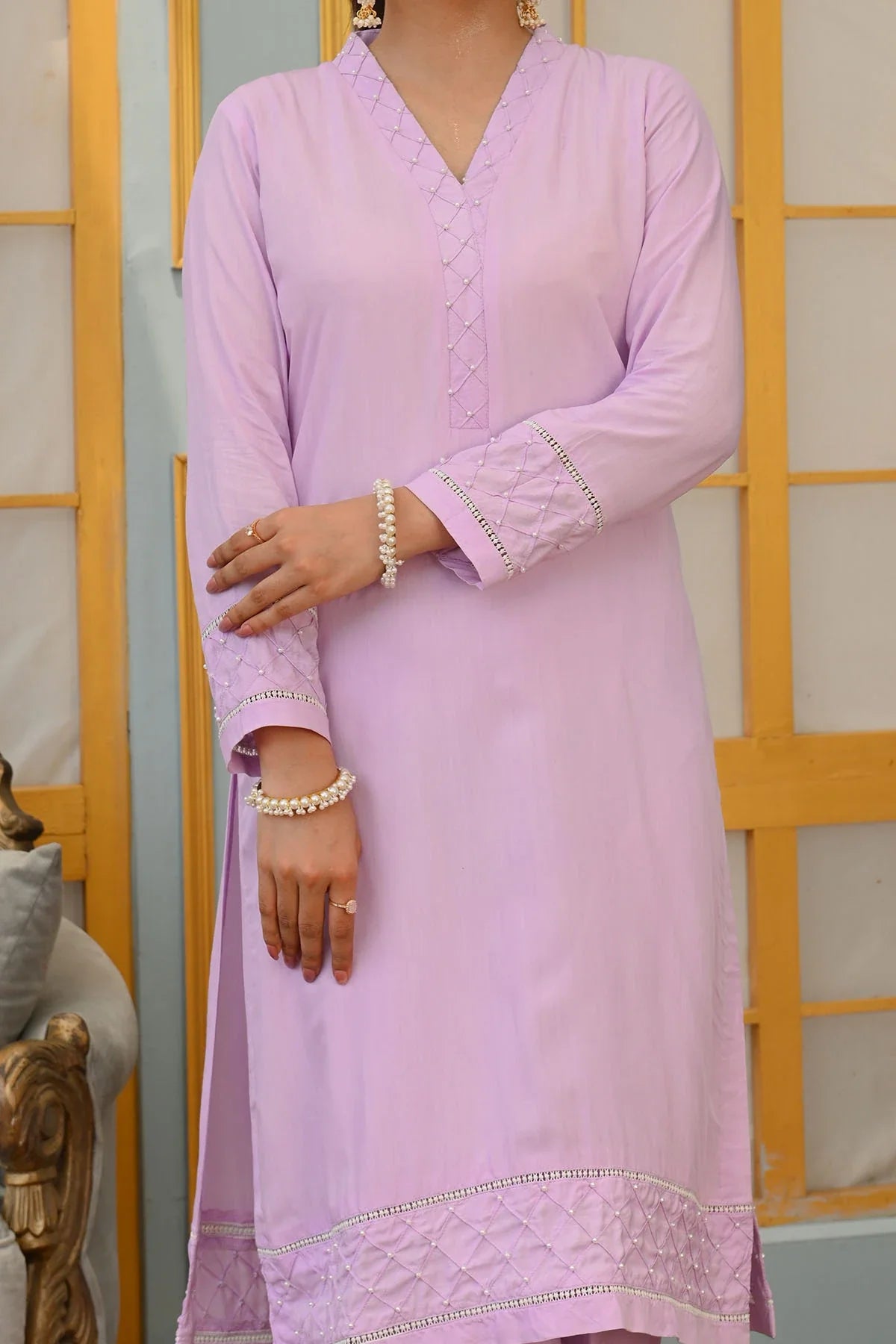 This elegant solid purple dress exudes sophistication and timeless beauty. The dress is meticulously embellished with exquisite pearl work, adding a touch of opulence. The pearl work is thoughtfully placed to enhance the dress’s design. Paired with same color trouser and also pearls work detailing on it. The overall effect is a harmonious blend of classic elegance and modern luxury, making this dress perfect for formal occasions, evening events.