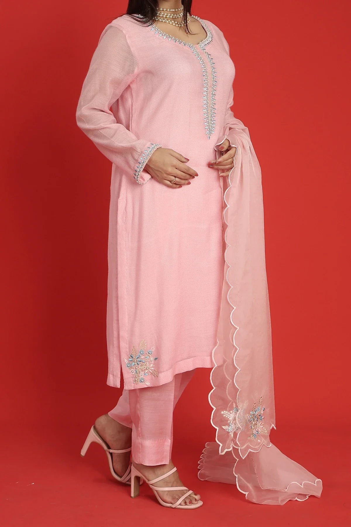 This timeless three-piece ensemble is crafted from pure Khadi Net, adorned with intricate Resham embroidery and exquisite handwork featuring pearls, Naqshi, and crystals delicately placed on the neckline, sleeves, and shirt hem. The look is completed with a beautifully detailed organza dupatta, featuring elegant cutwork and floral bunches on all four sides, paired with a matching raw silk trouser. A perfect choice for formal gatherings, adding grace and sophistication to your style.