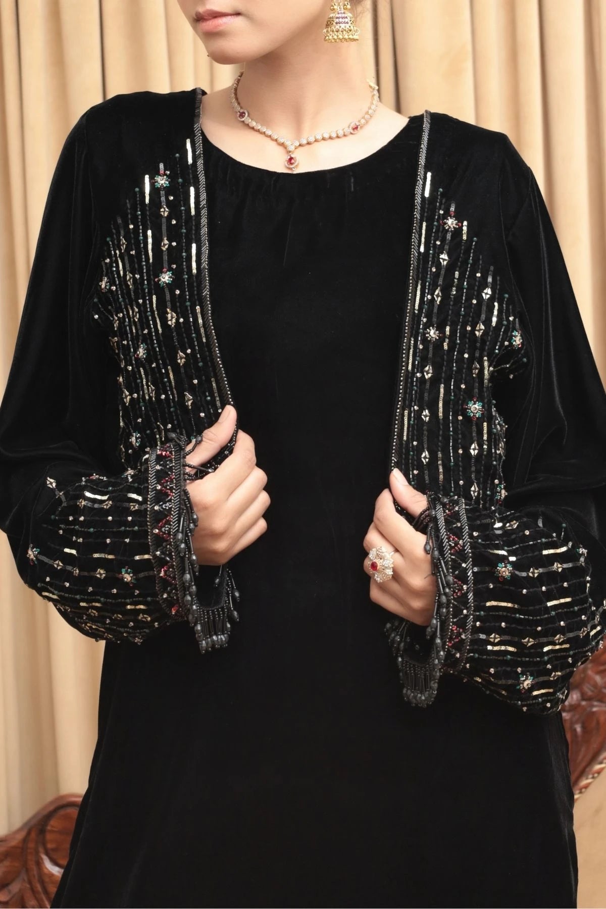 Refined and effortlessly elegant, Mehrveen is a black velvet jacket-style kaftan crafted for sophisticated evenings. The open-front silhouette is elevated with intricate hand embellishments along the sleeves and a beautifully detailed embellished back panel, adding depth and a subtle statement from every angle. Delicate beaded accents enhance the craftsmanship, while the fluid drape of velvet ensures graceful movement and comfort. Mehrveen embodies modern luxury with timeless charm, making it an ideal choice for formal gatherings and festive nights.