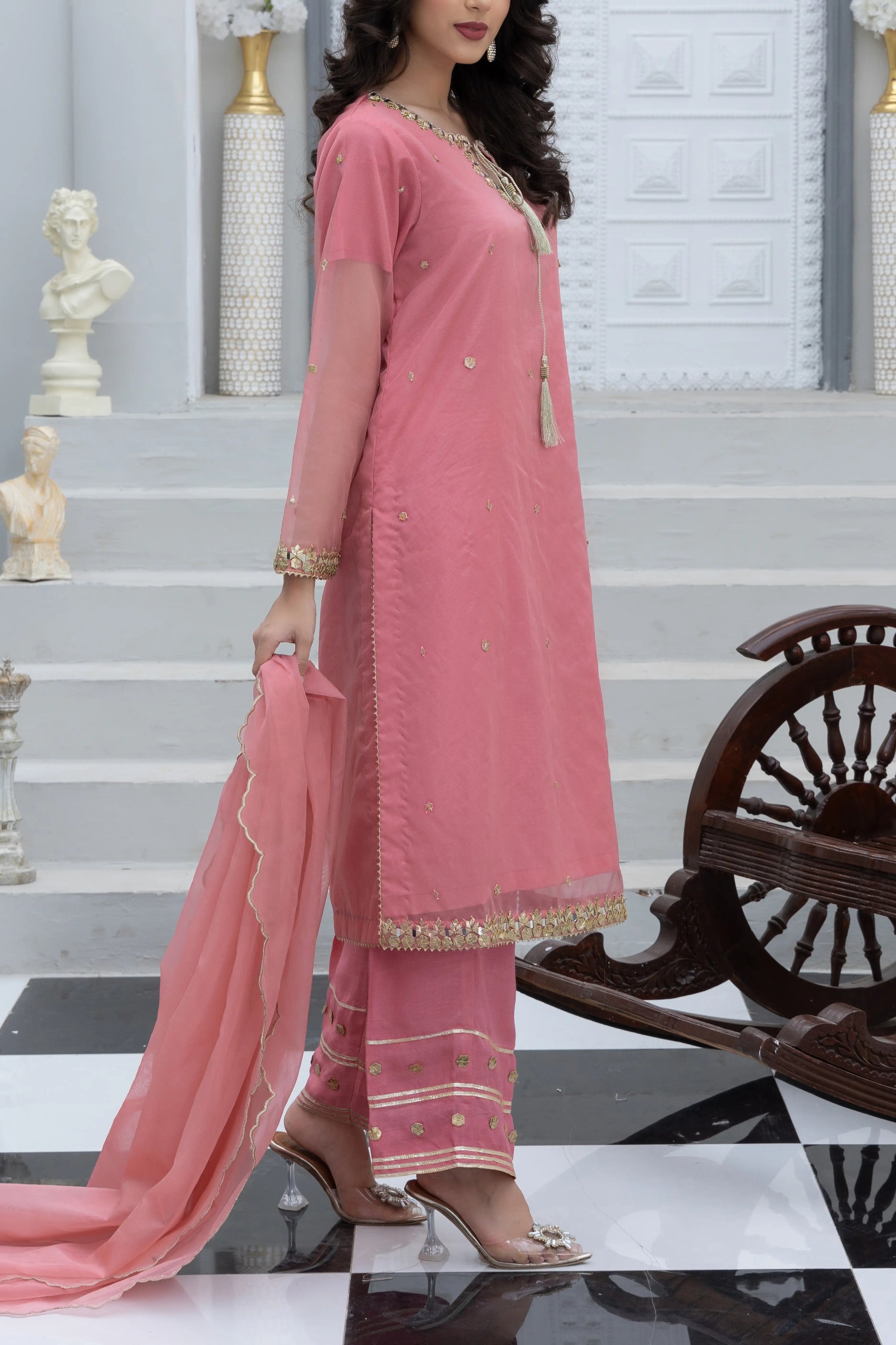 Soft, graceful, and effortlessly refined, Rosewood Blush is a celebration of muted elegance. Crafted in a dusty rose-pink hue, the kurta features delicate gold hand embellishments scattered across the canvas, complemented by an intricately finished neckline and cuffs. The matching trousers are detailed with subtle accents, while the Organza dupatta—edged with fine gold finishing—adds fluid movement and charm. Designed for daytime festivities, intimate gatherings, and elegant soirées.