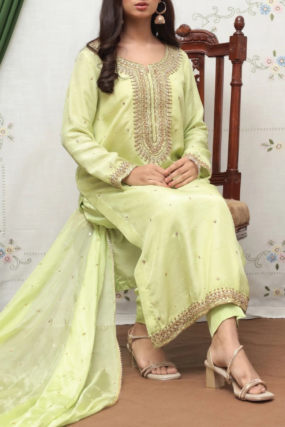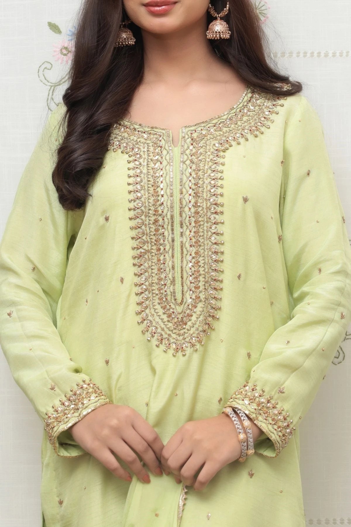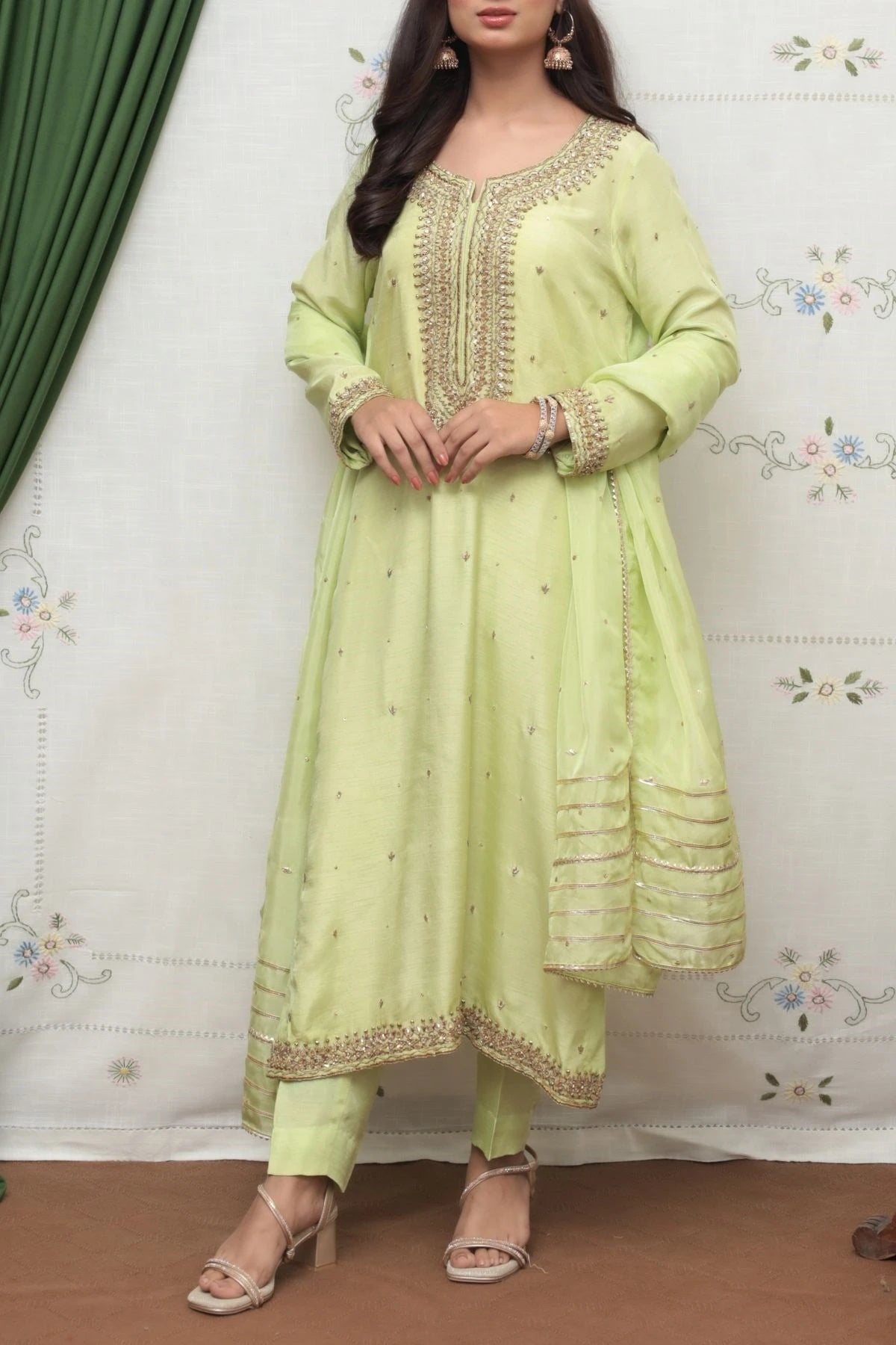 Graceful and softly radiant, Soraya is crafted in a refreshing pistachio green hue that reflects understated elegance. The kurta features delicate hand embellishments scattered across the canvas, paired with an intricately detailed neckline that adds a refined festive glow. Designed with fluid movement and a flattering silhouette, it is finished with embellished cuffs and a subtly accented hem. Paired with matching straight pants and a coordinating dupatta highlighted with fine striping along the borders, Soraya is ideal for daytime festivities, intimate celebrations, and elegant gatherings.