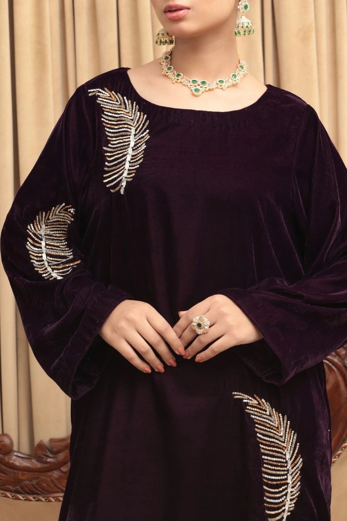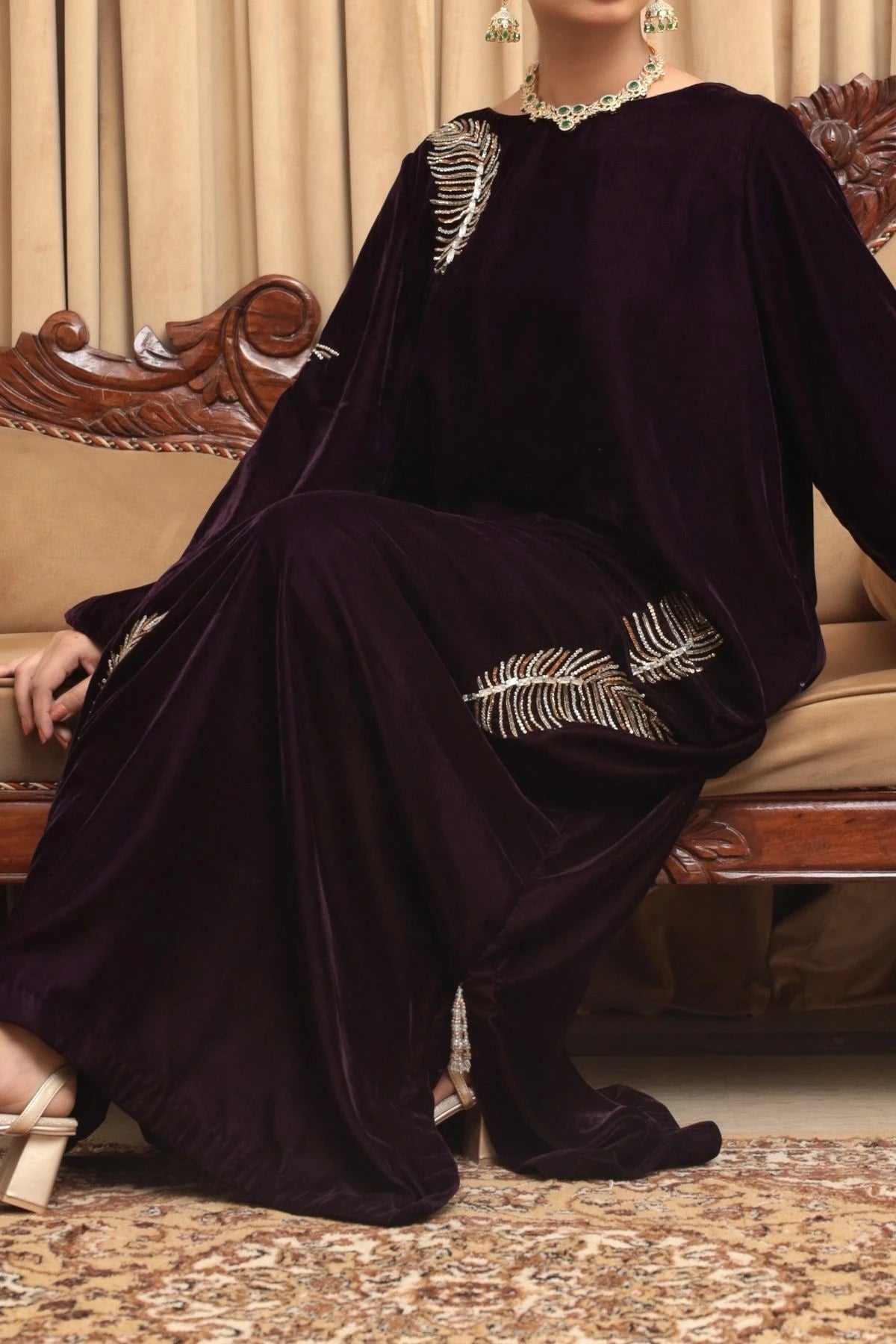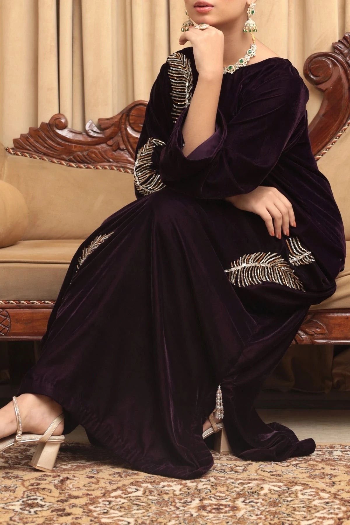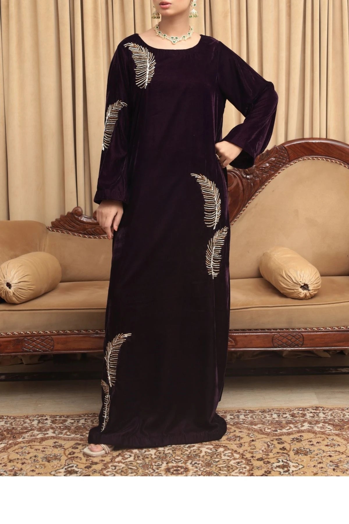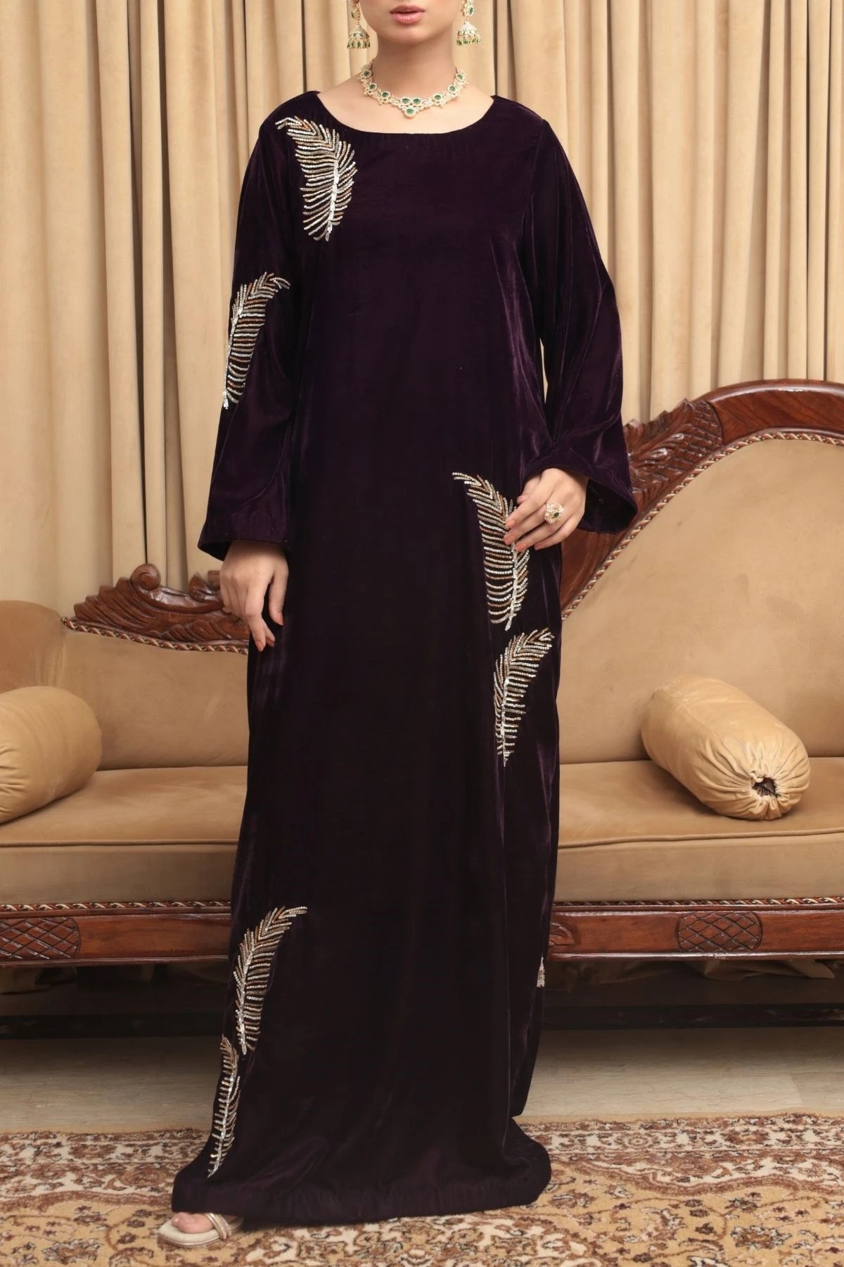 Gracefully radiant, Ziva is a deep plum velvet kaftan designed for refined festivities and elegant evenings. The fluid silhouette drapes effortlessly, offering comfort wrapped in understated luxury. Delicate hand embellishments inspired by organic motifs are scattered across the kaftan, adding a soft golden shimmer that enhances the richness of the velvet. With its clean neckline and relaxed form, Ziva embodies timeless sophistication and effortless festive charm.